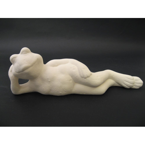 Réf. 03-022 grenouille allongée, figurine, L 29 x l 10 x h 10 ; biscuit de faïence fine (céramique brute à peindre ou à émailler)