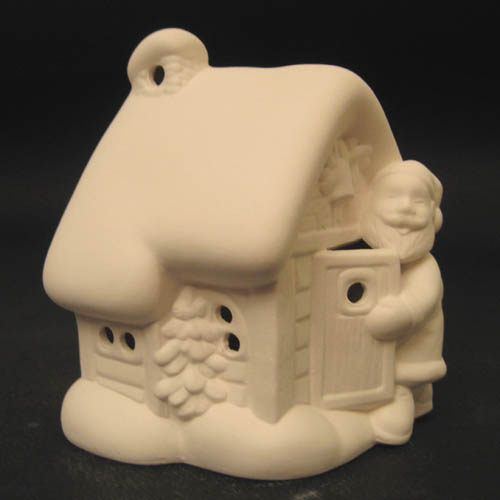 Réf. N°051 Père Noël et maison, figurine / photophore, L 14 x l 8 x h 18 ; biscuit de faïence fine (céramique brute à peindre ou à émailler)