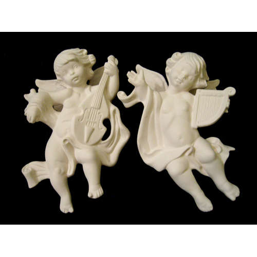Réf. N°035 ange avec lyre, figurine, L 6 x l 5 x h 15 ; biscuit de faïence fine (céramique brute à peindre ou à émailler)