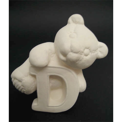 Réf. 04-006-3 ourson en peluche lettre « D », figurine, L 8 x l 6 x h 8 ; biscuit de faïence fine (céramique brute à peindre ou à émailler)