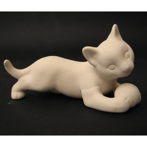 Réf. 06-005 chat avec balle, figurine, L 14 x l 6 x h 7,5 ; biscuit en faïence fine (céramique brute)
