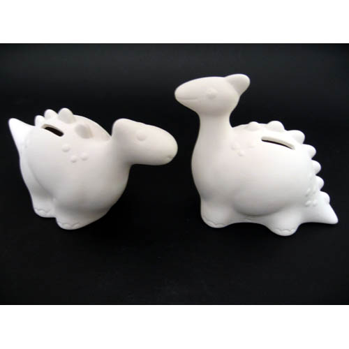 Réf. N°084-2 dinosaure tête dressée, tirelire sans bouchon, L 14 x l 8 x h 13 ; biscuit de faïence fine (céramique brute à peindre ou à émailler)