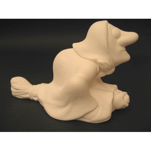 Réf. N°180 sorcière sur balai, figurine, L 23 x l 11,5 x h 14,5 ; biscuit de faïence fine (céramique brute à peindre ou à émailler)