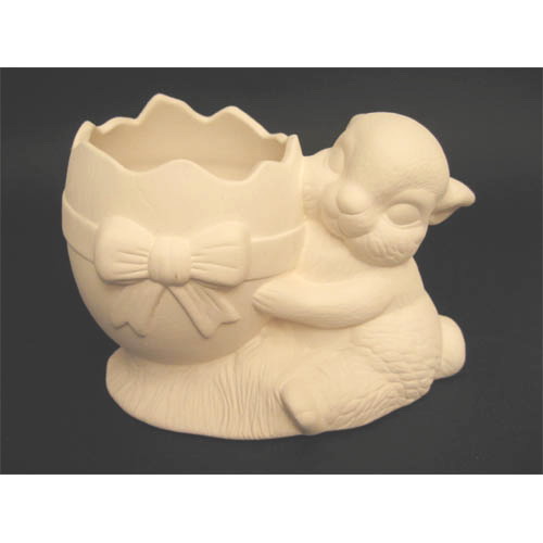Réf. 05-010 lapin avec oeuf cassé, bonbonnière / porte-crayons / cache-pot, L 17 x l 10,5 x h 11,5 ; biscuit de faïence fine (céramique brute à peindre ou à émailler)