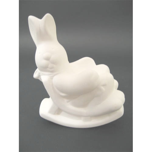 Réf. N°123 lapin sur chaise à bascule, coquetier, L 9,5 x l 6 x h 11 ; biscuit de faïence fine (céramique brute à peindre ou à émailler)