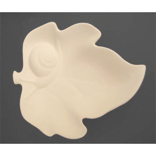 Réf. 12-011-2 feuille avec escargot, vide-poches, L 17 x l 14,5 x h 3,8 ; biscuit de faïence fine (céramique brute à peindre ou à émailler)