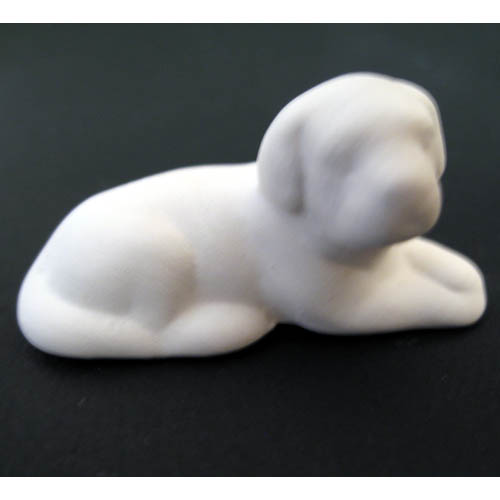Réf. 07-008-3 chiot allongé, mini figurine, L 5,7 x l 2,5 x h 2,5 ; biscuit de faïence fine (céramique brute)