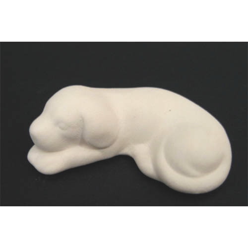 Réf. 07-024-4 chiot couché, figurine, L 6 x l 3,5 x h 2 ; biscuit de faïence fine (céramique brute)