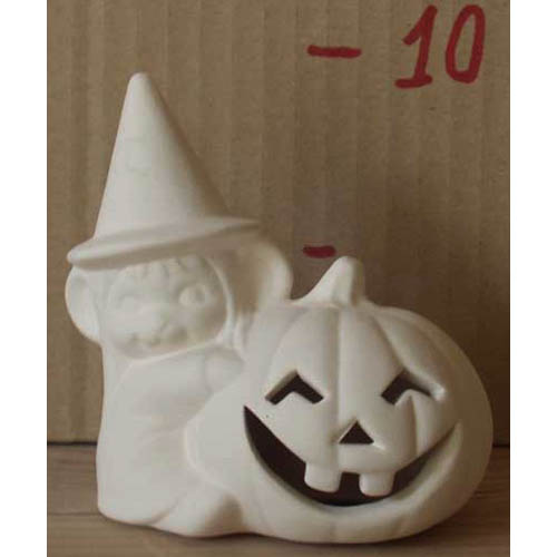 Réf. 11-096 souris avec citrouille, figurine, L 9 x h 9 ; biscuit de faïence fine (céramique brute)
