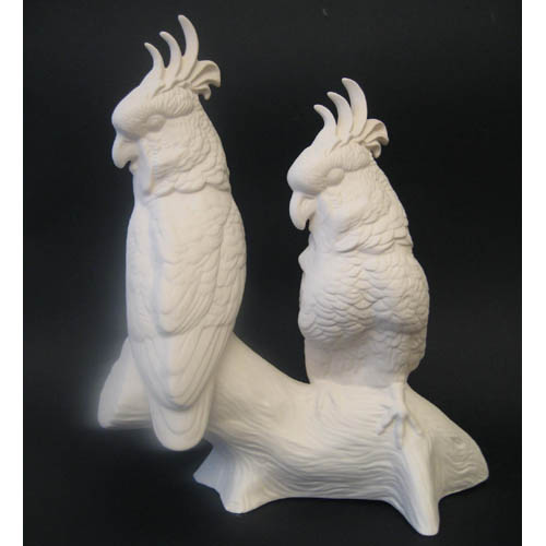 Réf. 10-040 deux perroquets, figurine, L 25 x l 13 x h 32 ; biscuit de faïence fine (céramique brute à peindre ou à émailler)