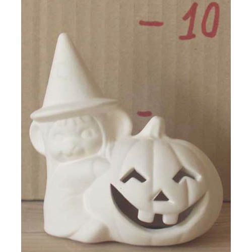 Réf. 11-096 souris avec citrouille, figurine, L 9 x h 9 ; biscuit de faïence fine (céramique brute à peindre ou à émailler)