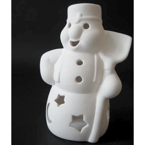 Réf. N°199 bonhomme de neige avec pelle, photophore, L 8,5 x l 7 x h 14 ; biscuit de faïence fine (céramique brute à peindre ou à émailler)