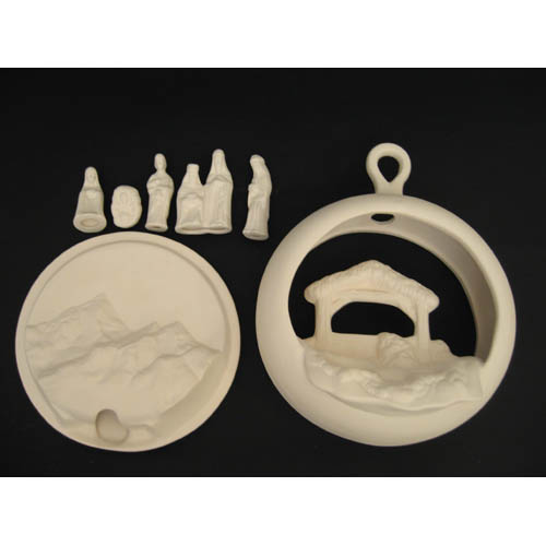 Réf. 01-102-1 crèche de Noël, groupe de semi-sphère et de cinq figurines (détails) ; biscuits de faïence fine (céramique brute à peindre ou à émailler)