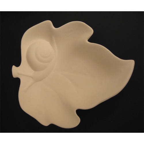 Réf. 12-011-2 feuille avec escargot, vide-poches, L 17 x l 14,5 x h 3,8 ; biscuit de faïence fine (céramique brute à peindre ou à émailler)