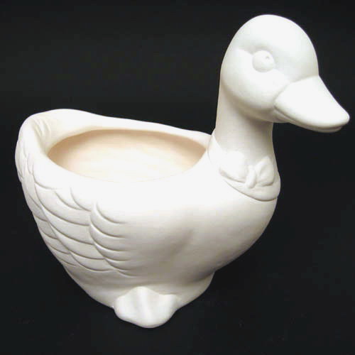 Réf. N°152-1 canard tête droite, bonbonnière / cache-pot, L 17 x l 12 x h 15 ; biscuit de faïence fine (céramique brute à peindre ou à émailler)