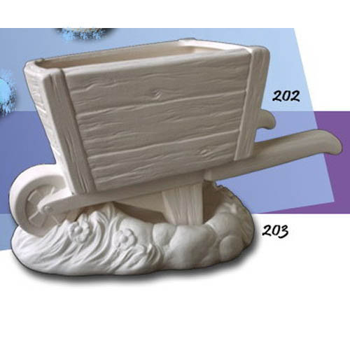 Réf. N°202 brouette, cache-pot, L 26 x l 14 x h 14 ; biscuit de faïence fine (céramique brute à peindre ou à émailler)