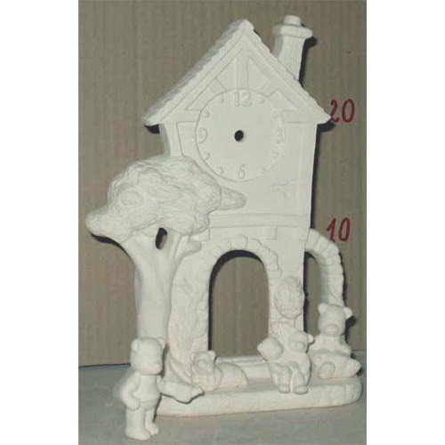 Réf. 04-077-2 tour d'horloge et oursons, groupe de cinq figurines (oursons réf. 04-078-1 à 04-078-4), h 28 ; biscuits de faïence fine (céramique brute à peindre ou à émailler)
