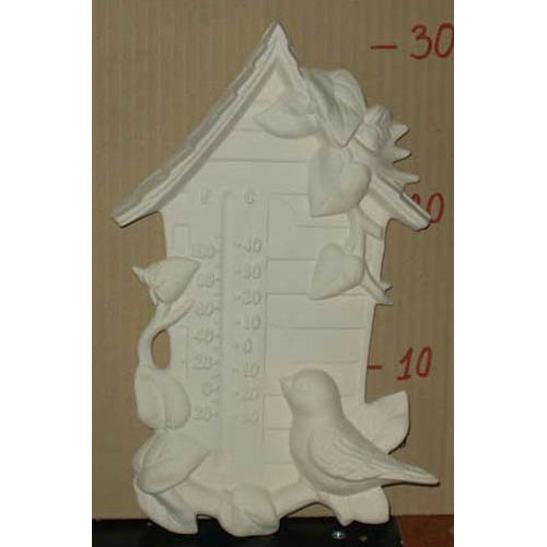 Réf. 10-030 support de thermomètre avec oiseau, figurine, h 32 ; biscuit de faïence fine (céramique brute à peindre ou à émailler)