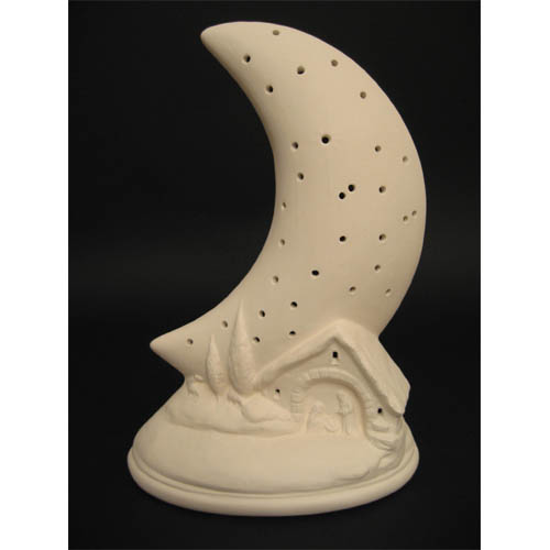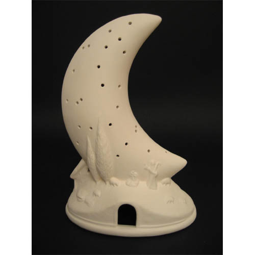 Réf. 13-004-1 lune et crèche de Noël, applique pour veilleuse / photophore (face), L 15 x l 11 h 23 ; biscuit de faïence fine (céramique brute à peindre ou à émailler)