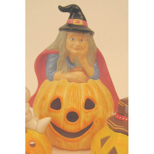 Réf. N°159a sorcière sur citrouille, figurine / photophore peint, L 15, 5 x l 15 x h 22