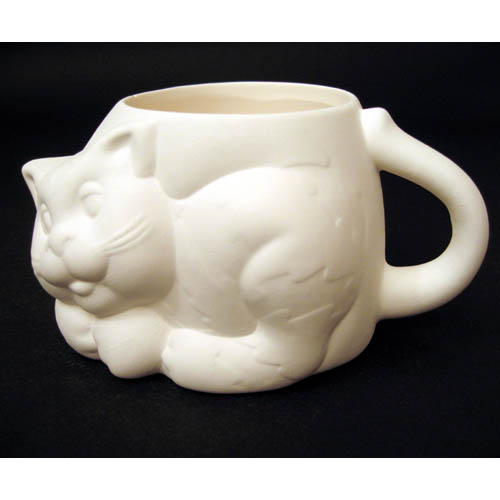 Réf. N°031 chat, mug / porte-crayons, L 15 x l 9,5 x h 8 ; biscuit de faïence fine (céramique brute à peindre ou à émailler)