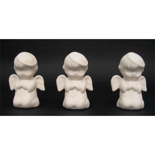 Réf. 14-025 anges priants, groupe de trois figurines, L 4 x l 2,5 x h 5,6 ; biscuits de faïence fine (céramique brute à peindre ou à émailler)