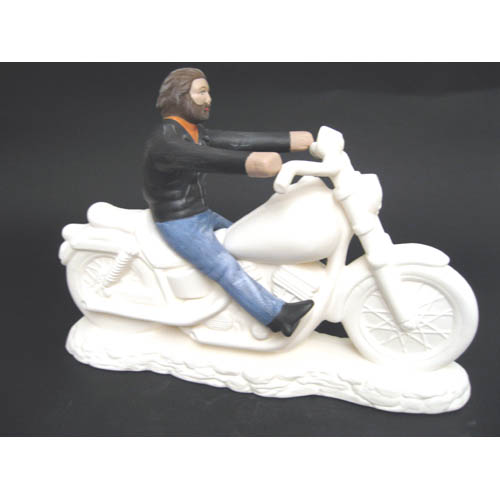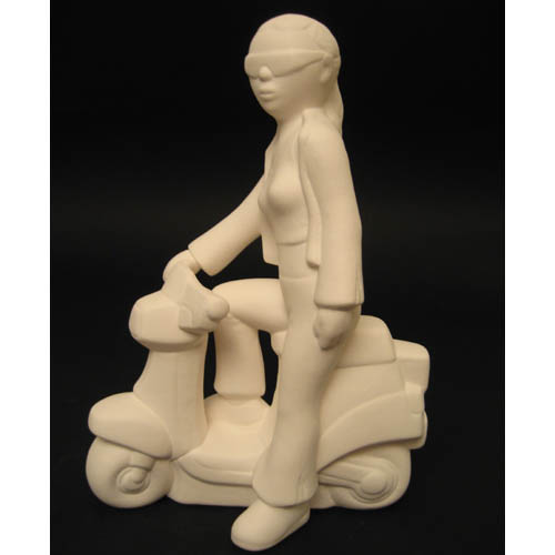 Réf. N°166 jeune fille sur scooter, figurine, L 14,5 x l 8 x h 21 ; biscuit de faïence fine (céramique brute à peindre ou à émailler)