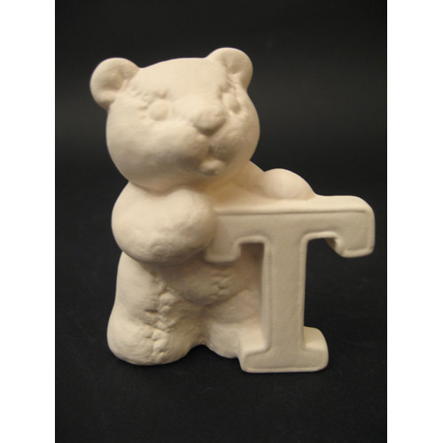 Réf. 04-006-16 ourson en peluche lettre « T », figurine, biscuit en faïence fine (céramique brute), L 7 x l 5 x h 8
