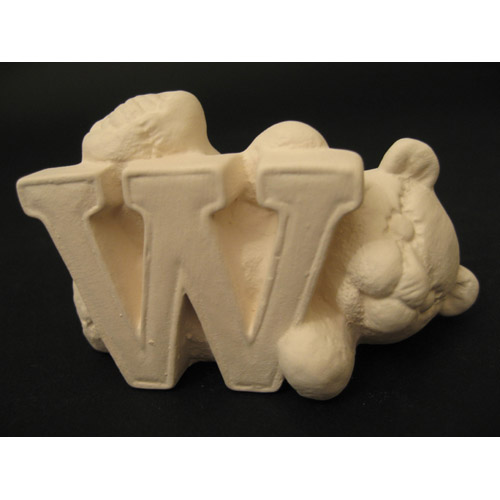 Réf. 04-006-18 ourson en peluche lettre « W », figurine, biscuit en faïence fine (céramique brute), L 9 x l 4 x h 5,7