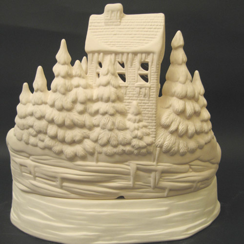 Réf. 01-014-1 (détail dos) chevaux en hiver, groupe de huit figurines (possibilité de mettre une ampoule ou des bougies), L 29 x l 22 x h 27 ; biscuit de faïence fine (céramique brute à peindre ou à émailler)
