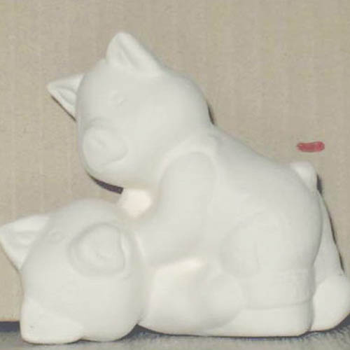 Réf. 11-047 deux cochons, figurine, h 8 ; biscuit de faïence fine (céramique brute à peindre ou à émailler)