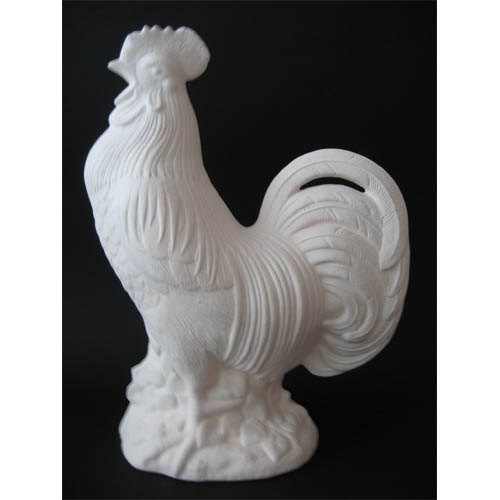 Réf. 09-004 grand coq, figurine, L 29 x l 19 x h 41 ; biscuit de faïence fine (céramique brute à peindre ou à émailler)