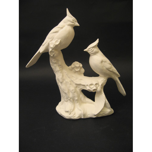 Réf. 10-092 deux perruches sur branche, figurine (dos), L 23 x l 10 x h 25 ; biscuit de faïence fine (céramique brute à peindre ou à émailler)