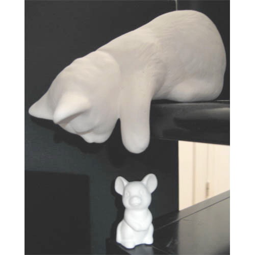 Réf. 06-004 chat pour étagère et souris, groupe de deux figurines, L 18 x l 8,5 x h 9 ; L 4 x l 4,5 x h 7, biscuits en faïence fine (céramique brute)