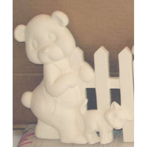 Réf. 04-058-1 ourson avec chat, sculpture murale, h 28 ; biscuit de faïence fine (céramique brute à peindre ou à émailler)