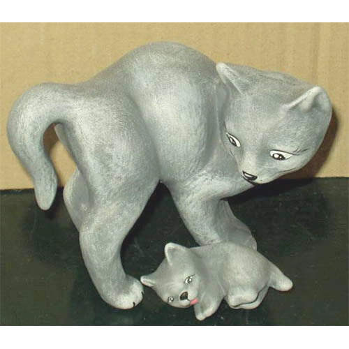Réf. 06-003b chatte avec chaton, groupe de deux figurines, biscuits en faïence fine peints, L 13,5 x l 8 x h 10 ; L 6 x l 3 x h 3,5