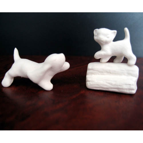 Réf. 06-051 chaton et chiot, groupe de trois figurines : chat L 2 x l 0,5 x h 1 ; chien L 3 x l 1,5 x h 1,5 ; bois L 2 x l 1,7 x h 0,7 ; biscuit de faïence fine (céramique brute)