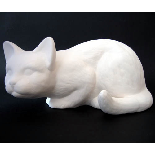Réf. 06-017 chat couché, figurine, L 16 x l 9 x h 13 ; biscuit de faïence fine (céramique brute)