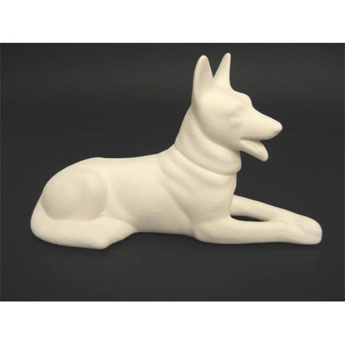 Réf. 07-013 berger allemand couché, figurine, L 16 x l 5,5 x h 10 ; biscuit de faïence fine (céramique brute)