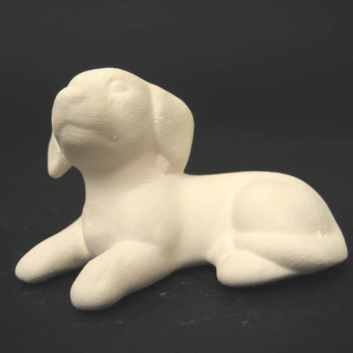 Réf. 07-008-3 chiot allongé, mini figurine, L 5,7 x l 2,5 x h 2,5 ; biscuit de faïence fine (céramique brute)