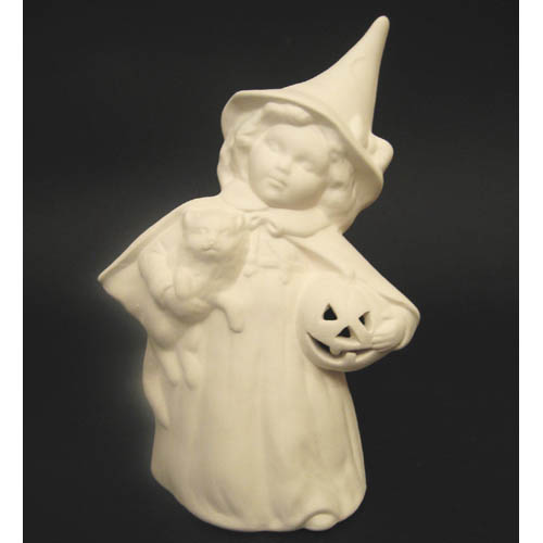 Réf. 15-041 sorcière avec chat et citrouille, figurine, L 11,5 x l 9 x h 17,5 ; biscuit de faïence fine (céramique brute à peindre ou à émailler)