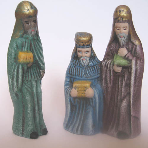 Réf. 01-102-4b-5 les trois rois mages, groupe de deux figurines peintes: mage, L 2,5 x l 2,5 x h 8 ; mages L 5,3 x l 3 x h 8