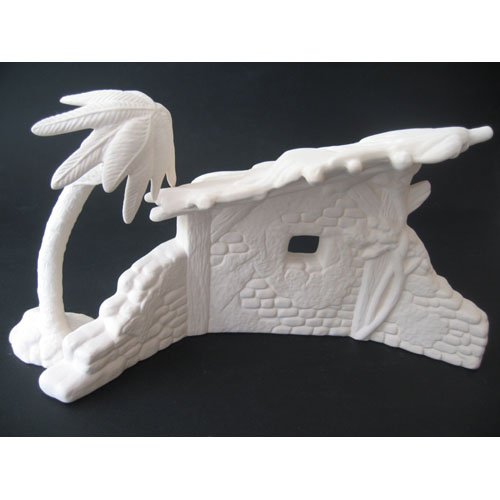 Réf. 13-073-2 étable et palmier, ensemble de deux figurines; L 30 x l 13 x h 16, L 10 x l 9 x h 17