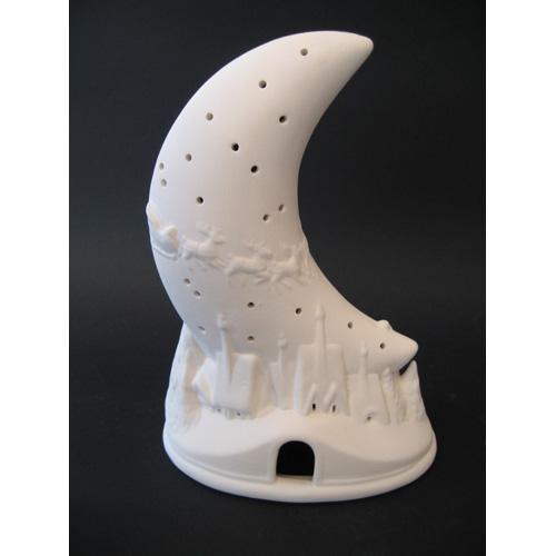 Réf. 01-116 Père Noël sur la Lune, applique pour veilleuse / photophore, L 15 x l 10 x h 22 (dos) ; biscuit de faïence fine (céramique brute à peindre ou à émailler)