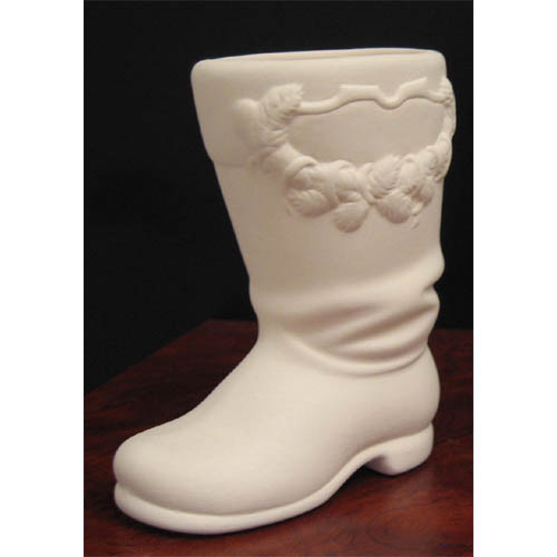 Réf. N°052 botte, porte-crayons / vase à fleurs séchées, L 9 x l 4 x h 11 ; biscuit de faïence fine (céramique brute à peindre ou à émailler)