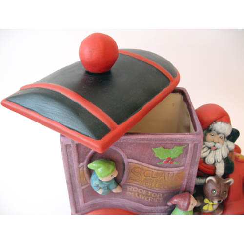 Réf. 01-089b Père Noël avec automobile, figurine / boîte / bonbonnière peinte (détail : couvercle semi-ouvert), L 30 x l 15 x h 29