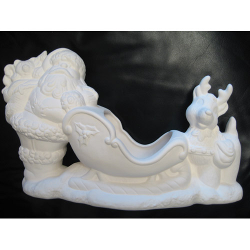 Réf. 01-147 Père Noël en traîneau et un renne, figurine / bonbonnière, L 32 x l 11 x h 19 ; biscuit de faïence fine (céramique brute à peindre ou à émailler)