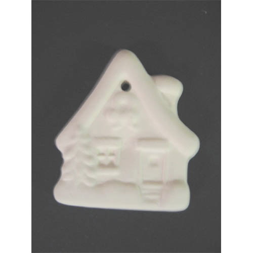 Réf. 01-146-2 maison, mini figurine à suspendre, dos plat, L 4,5 x l 0,7 x h 5 ; biscuit de faïence fine (céramique brute à peindre ou à émailler)