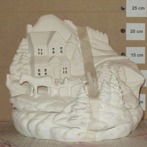 Réf. 01-122 maison en hiver et charrette, groupe de figurines, h 22 ; biscuits de faïence fine (céramique brute à peindre ou à émailler)