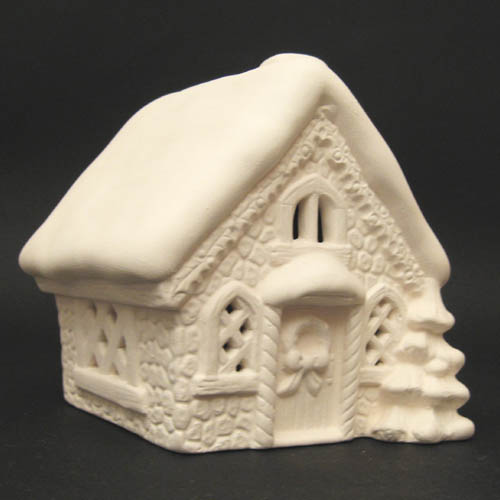 Réf. 01-104-2 maisonnette décorée, figurine / photophore, L 12,5 x l 12 x h 13,5 ; biscuit de faïence fine (céramique brute à peindre ou à émailler)